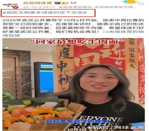 此外,在鄭欽文剛回到武漢沒多久,央視體育官網(wǎng)在報道這則消息時,已經(jīng)提前說了鄭欽文會退出武網(wǎng)一事,標(biāo)題“鄭欽文和家鄉(xiāng)球迷約定下次見”就是最好的證明。