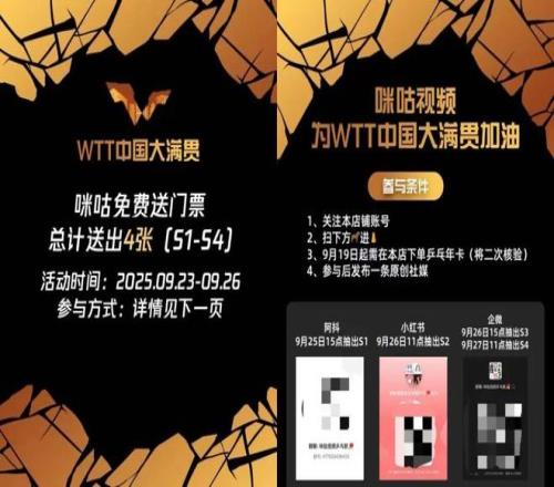 其中,WTT的官方轉播合作伙伴咪咕,深諳乒乓球迷的核心需求。在賽事籌備階段,咪咕便推出了「觀賽禮包」產品,將WTT門票與全站會員權益進行捆綁銷售。至于其他余票,咪咕也采用了相似的形式,球迷在官方渠道下單乒乓球年卡會員后,可以通過抖音、小紅書和企業微信在不同時間抽取門票。