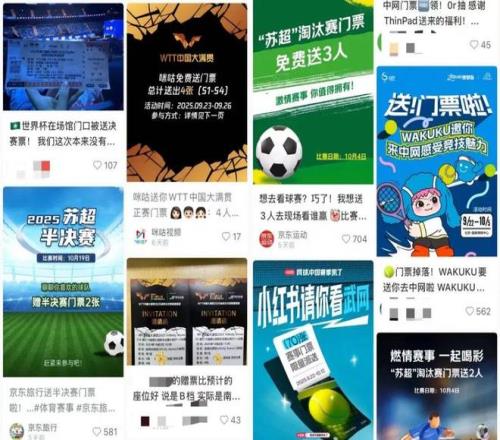 同樣地,在體育賽事運營中,也會有一定數量的球票通過不同形式被贈出。當我們在社交媒體鍵入「體育贈票」并搜索時,就會發現中國網球公開賽、上海大師賽、中超乃至此前爆火的蘇超皆有贈票活動。