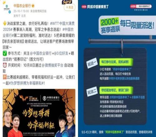 與此同時,包括庫迪、中國農業銀行等在內的更多合作方則選擇了社交媒體互動的路徑,在小紅書、微博、抖音等社媒平臺,發布諸如「關注+轉發,抽球迷送WTT門票」的活動層出不窮。