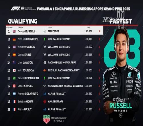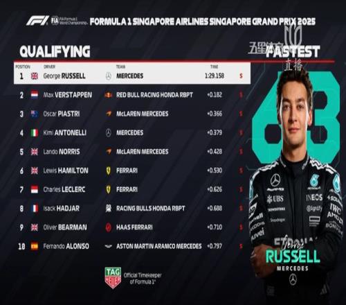 2025賽季F1新加坡大獎賽戰火再燃,在北京時間今天晚間舉行的排位賽中,梅奔車隊的拉塞爾在維斯塔潘與麥克拉倫雙雄的競爭中殺出重圍,以1:29.158的超強成績,奪得新加坡站桿位!奪得了個人賽季第二桿!