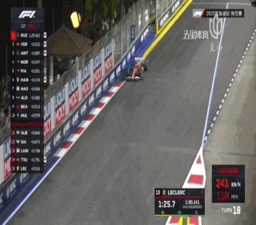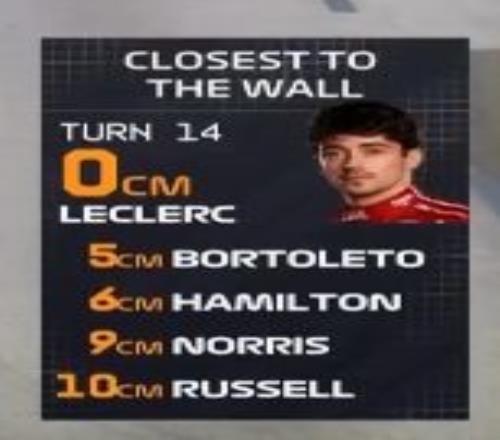 值得一提的是,在這條賽道上,大家都跑得十分極限,勒克萊爾在14號彎跑出了貼墻0cm的極限走位......