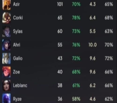 Chovy英雄使用情況:沙皇101場70%勝率,飛機65場78%勝率 大精靈 2025-10-06 13:00:14 電競體育10月6報道 外媒統計Chovy職業生涯英雄使用情況,具體如下:沙皇101場70%勝率;飛機65場78%勝率;塞拉斯60場73%勝率;狐貍55場76%勝率;加里奧43場72%勝率;佐伊40場68%勝率;妖姬38場61%勝率;瑞茲36場58%勝率;發條34場59%勝率;阿卡麗32場72%勝率;維克托31場55%勝率;永恩31場84%勝率;巖雀27場85%勝率;小炮25場76%勝率 上一篇: AL分享Hope禮物拆箱返圖:感謝大家準備的禮物和蛋糕 下一篇: 康康看決賽:我體會到你們看EDG比賽的心情了,現在話都說不出來