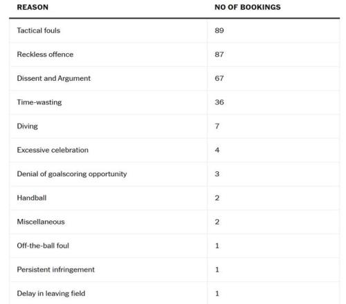 進一步分析,在第75分鐘(包括暫停)之后,他們共收到107張黃牌,其中55張是因戰術犯規(29張)和魯莽犯規(26張),而24張是因異議/爭論。