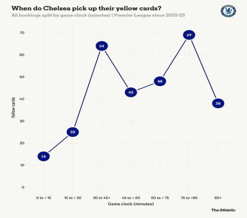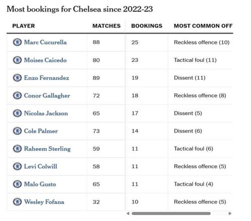 不可避免地,這些球員大多是防守型球員,但帕爾默、恩佐-費爾南德斯和雅克松在所有類別中因異議而吃到最多黃牌的事實,凸顯了球隊的一些不成熟。費爾南德斯在比賽日要么是隊長,要么是副隊長。他19張黃牌中有11張是因異議而吃到的,這很難說是一個好的榜樣。