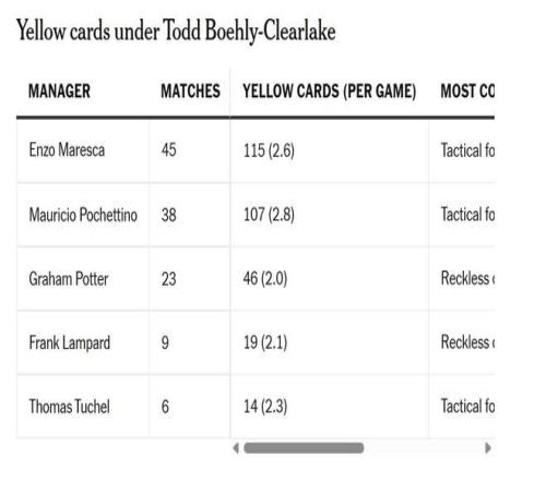 鑒于圖赫爾、波特和蘭帕德都在2022-23賽季執教過切爾西,因此很難評估該賽季的任何趨勢,但你可以從波切蒂諾(2023-24 年)和馬雷斯卡(2024 年至今)的任期中尋找某種模式,他們是英超聯賽中場均黃牌最多的切爾西主教練。