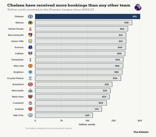 如下圖所示,切爾西在過去三年中累計的黃牌數(301)輕松超越其他任何一支球隊。切爾西在此期間的紅牌數也排名第二(12張,其中兩黃變一紅,六張直接紅牌),僅比狼隊少一張。