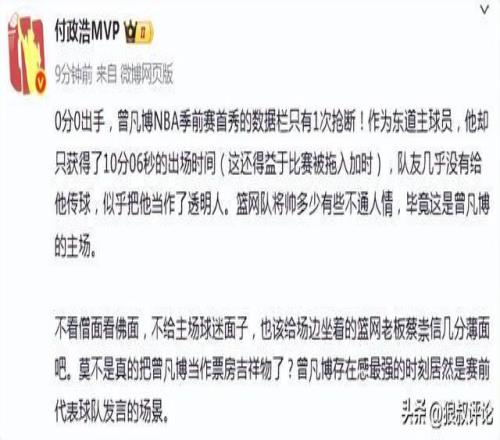 媒體人付政浩發文點評說道:0分0出手,曾凡博NBA季前賽首秀的數據欄只有1次搶斷!作為東道主球員,他卻只獲得了10分06秒的出場時間(這還得益于比賽被拖入加時),隊友幾乎沒有給他傳球,似乎把他當作了透明人?;@網隊將帥多少有些不通人情,畢竟這是曾凡博的主場。