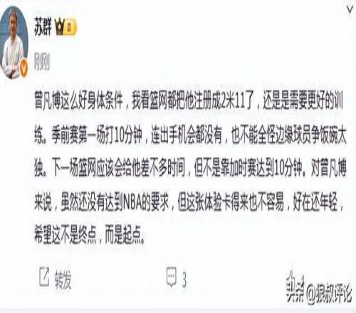 媒體人蘇群發(fā)文點評:曾凡博這么好身體條件,我看籃網(wǎng)都把他注冊成2米11了,還是需要更好的訓(xùn)練。季前賽第一場打10分鐘,連出手機會都沒有,也不能全怪邊緣球員爭飯碗太獨。下一場籃網(wǎng)應(yīng)該會給他差不多時間,但不是靠加時賽達到10分鐘。對曾凡博來說,雖然還沒有達到NBA的要求,但這張體驗卡得來也不容易,好在還年輕,希望這不是終點,而是起點。