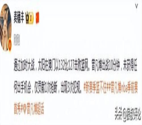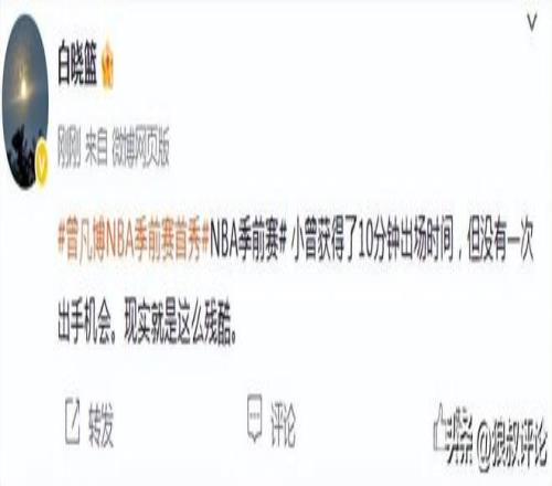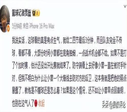 籃球記者賈磊發(fā)文點評:我說實話,這球看的真是有點生氣,就給二四節(jié)最后3分鐘,而且隊友完全不傳球,看都不看,大部分時間小曾都在底角抽煙,一點戰(zhàn)術(shù)機會都不給。如果不是打了個加時賽,估計還沒出汗比賽就結(jié)束了。