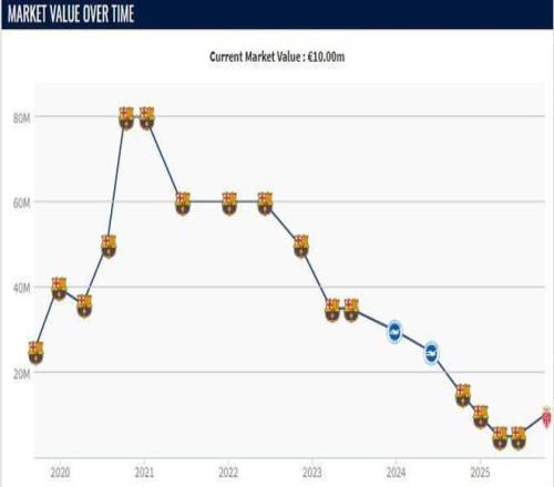 在最新一期的身價(jià)更新中,法蒂的身價(jià)上漲了500萬(wàn)歐元,達(dá)到了1000萬(wàn)歐元,他的巔峰身價(jià)是2020年8月為巴薩效力時(shí),當(dāng)時(shí)他的身價(jià)達(dá)到了8000萬(wàn)歐元。