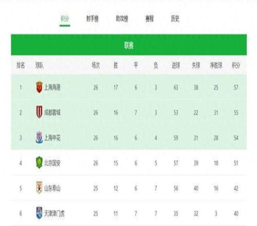中超第26輪后的積分榜。