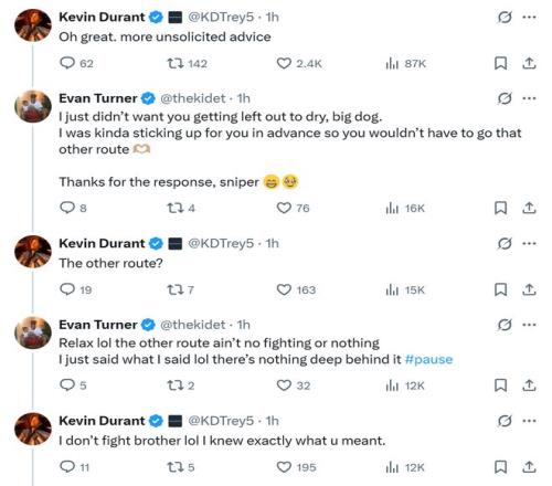 比賽中,火箭球員阿門·湯普森與鵜鶘球員阿爾瓦拉多爆發肢體沖突,前NBA球員埃文·特納隨后在個人社媒批評阿門不冷靜,杜蘭特隨后現身評論,兩人展開了對線。