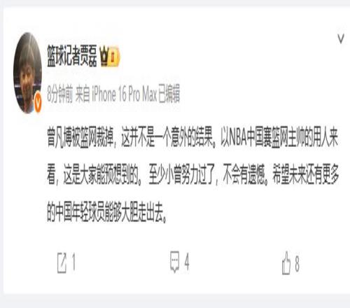 媒體人:曾凡博被裁不意外,希望年輕球員大膽走出去