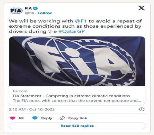 FIA官方發布動態,宣布將與 F1 攜手,防止車手遭遇的極端環境狀況重演。(圖/社交媒體截圖)