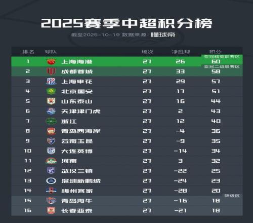 10月19日,中超第27輪的比賽全部結束。前三名本輪均取勝,依然只有3分差距。保級軍團方面,僅有深圳新鵬城拿到了分數。